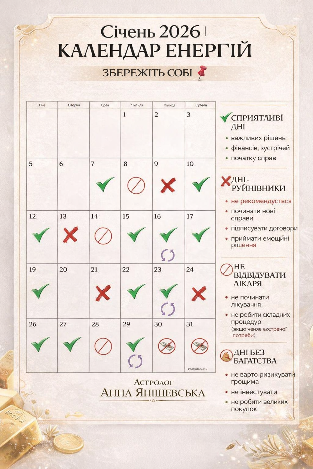 Січень 2026 — місяць, коли важливо діяти вчасно: простір або підтримує, або швидко показує, де ми втрачаємо ресурс. Щоб ви не діяли навмання, я підготувала календар енергій на січень 2026 з простими позначками: які дні підходять для справ, які краще переждати, а де потрібна обережність щодо здоров’я та фінансів. Що означають позначки в календарі енергій […]