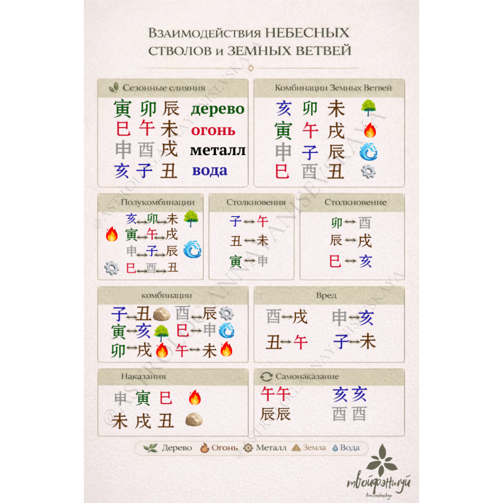 | Комбинации Земных Ветвей | 🐀 子 + 🐂 丑=земля 🐯 寅 + 🐖 亥=дерево 🐍 巳 + 🐒 申=вода 🐎 午 + 🐐 未=огонь | 🌍 Земля 🌳 Дерево 💧 Вода 🔥 Огонь |